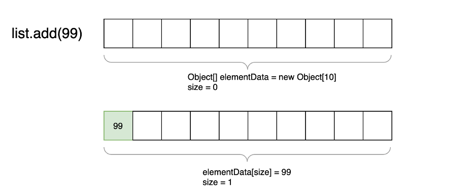 Khi bắt đầu thêm mới một phần tử, elementData sẽ được gán bằng một mảng mới có độ dài thường là bằng 10.
