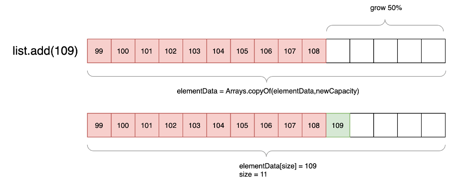 Khi ta lại thêm phần tử, elementData sẽ lại được khởi tạo bằng một array mới có size tăng thêm 50% size gốc