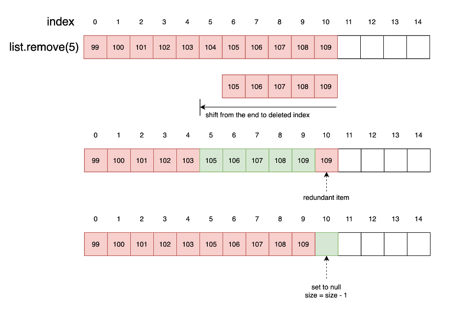 - Cách delete của ArrayList sẽ hoạt động kém nếu bạn delete với những index nhỏ, tệ nhất sẽ là index = 0. Giả sử list của bạn có size = 100. Nếu bạn delete phần tử đầu tiên, ArrayList sẽ phải copy 99 phần tử.