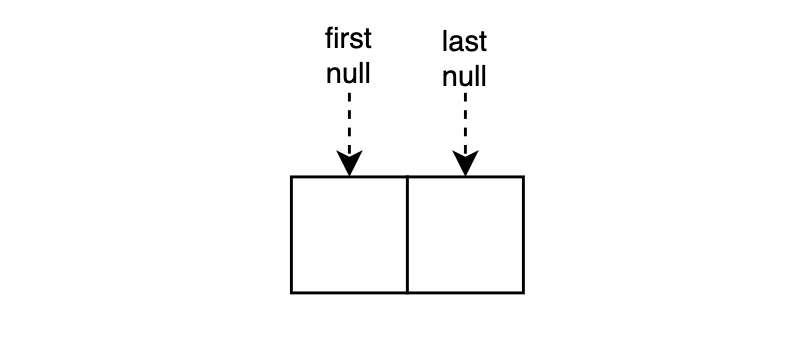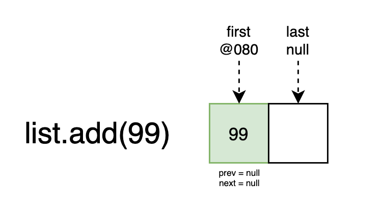 Khởi điểm, LinkedList sẽ bao gồm 2 node first và last đều mang giá trị null