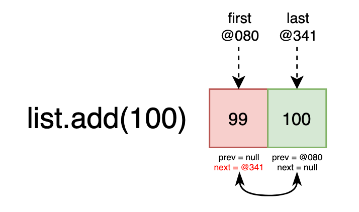 Khi thêm phần tử tiếp theo, thay vào node last và liên kết giữa node first và node last. Nay list đã có tối thiểu 2 node