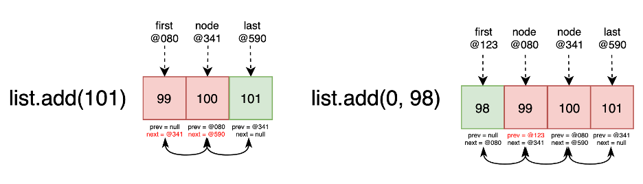 Cứ như vậy, khi tiếp tục insert, dù là ở cuối danh sách hay đầu danh sách, LinkedList chỉ việc liên kết các node lại với nhau