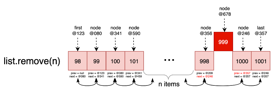 - Việc thêm hoặc xóa node trong LinkedList rất dễ dàng nhưng sẽ tệ dần nếu bạn insert/delete càng về trung tâm của list.