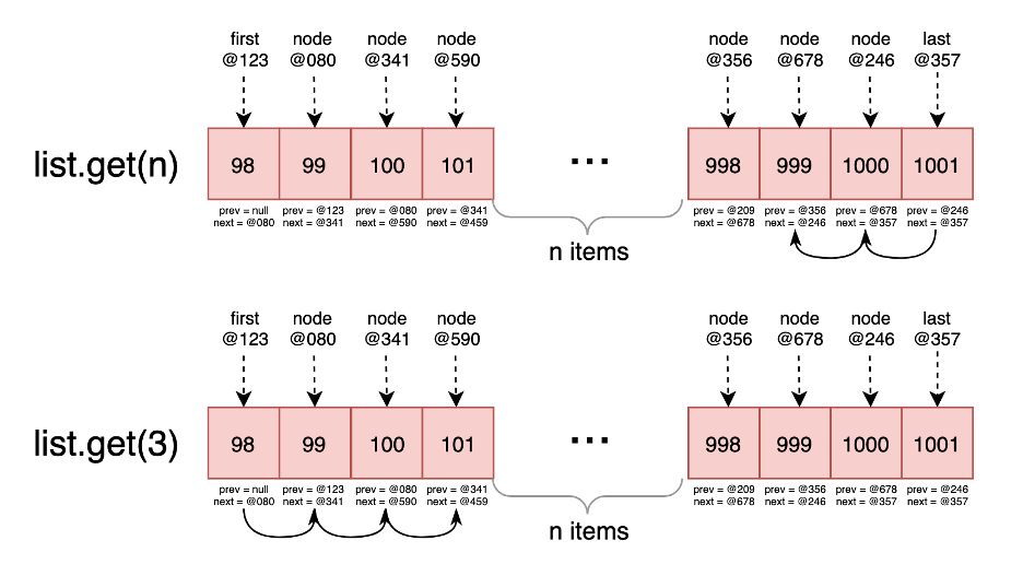 Khi cần lấy ra một phần tử ở index bất kỳ, không như ArrayList, LinkedList phải đi dần dần từng node một từ first hay last phụ thuộc vào index ở gần bên nào hơn.