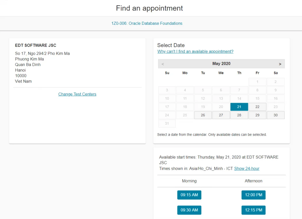 Chọn thời gian thi. Ngày thi và giờ thi sẽ phụ thuộc vào trung tâm thi mà bạn chọn, vậy nên, nếu thời gian thi không ưng ý, các bạn có thể thử chọn trung tâm khác.